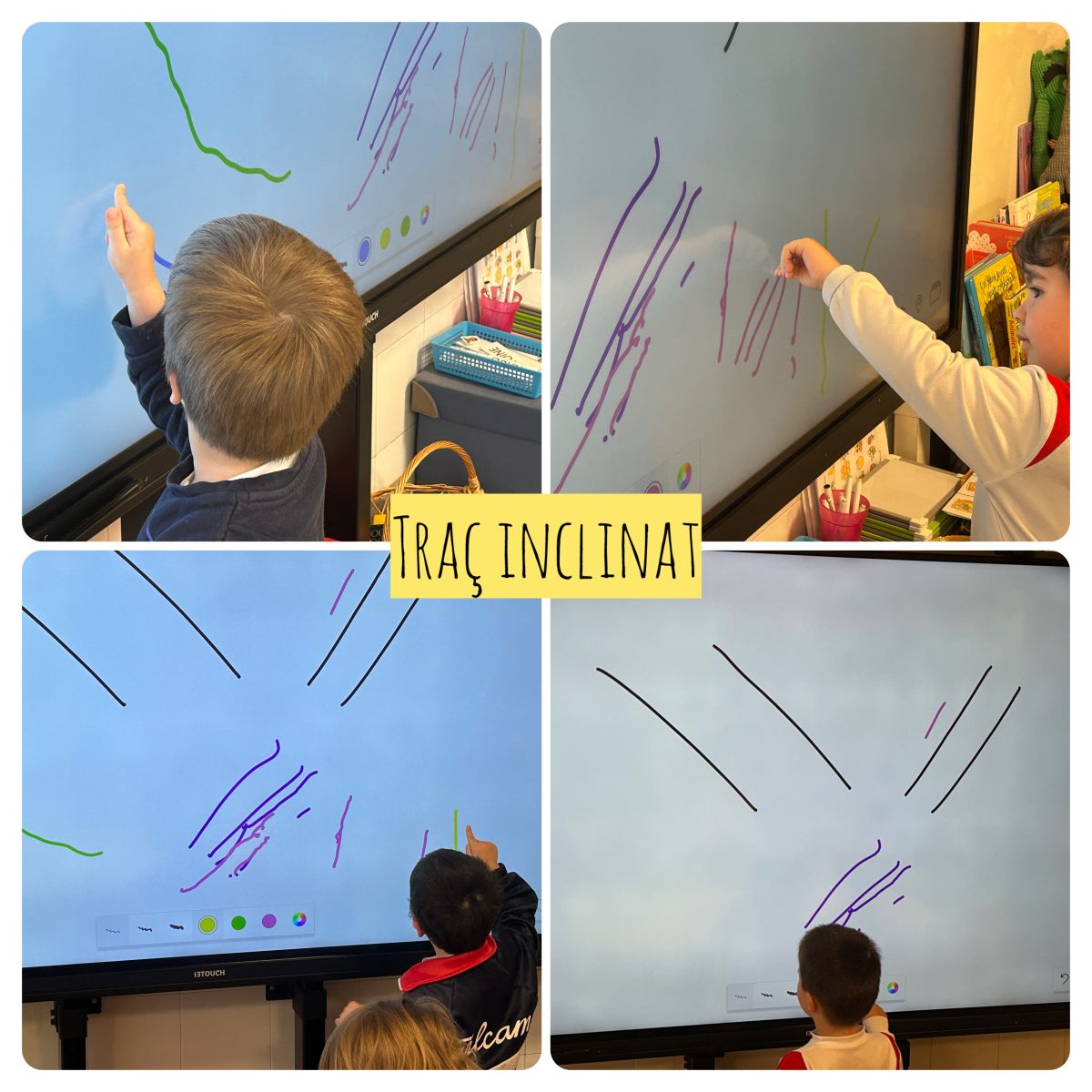 Seguim practicant traços, ja que contribueixen al desenvolupament de la nostra motricitat fina i coordinació mà-ull, habilitats essencials per a l’aprenentatge de l’escriptura. Aquesta setmana hem introduït el traç inclinat mitjançant diferents suports i materials.