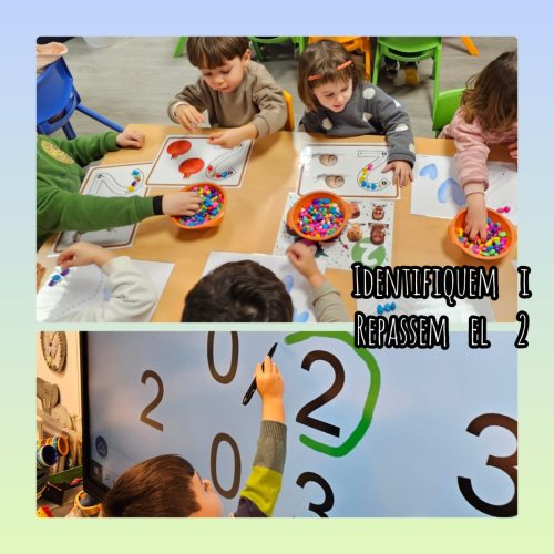 A matemàtiques hem sabut reconèixer el número 2 i hem treballat amb diferents propostes: fer sèries amb gots de colors, associar el número a la quantitat corresponent, distingir l’1 del 2 i programar el robot perquè vagi a la seva destinació.