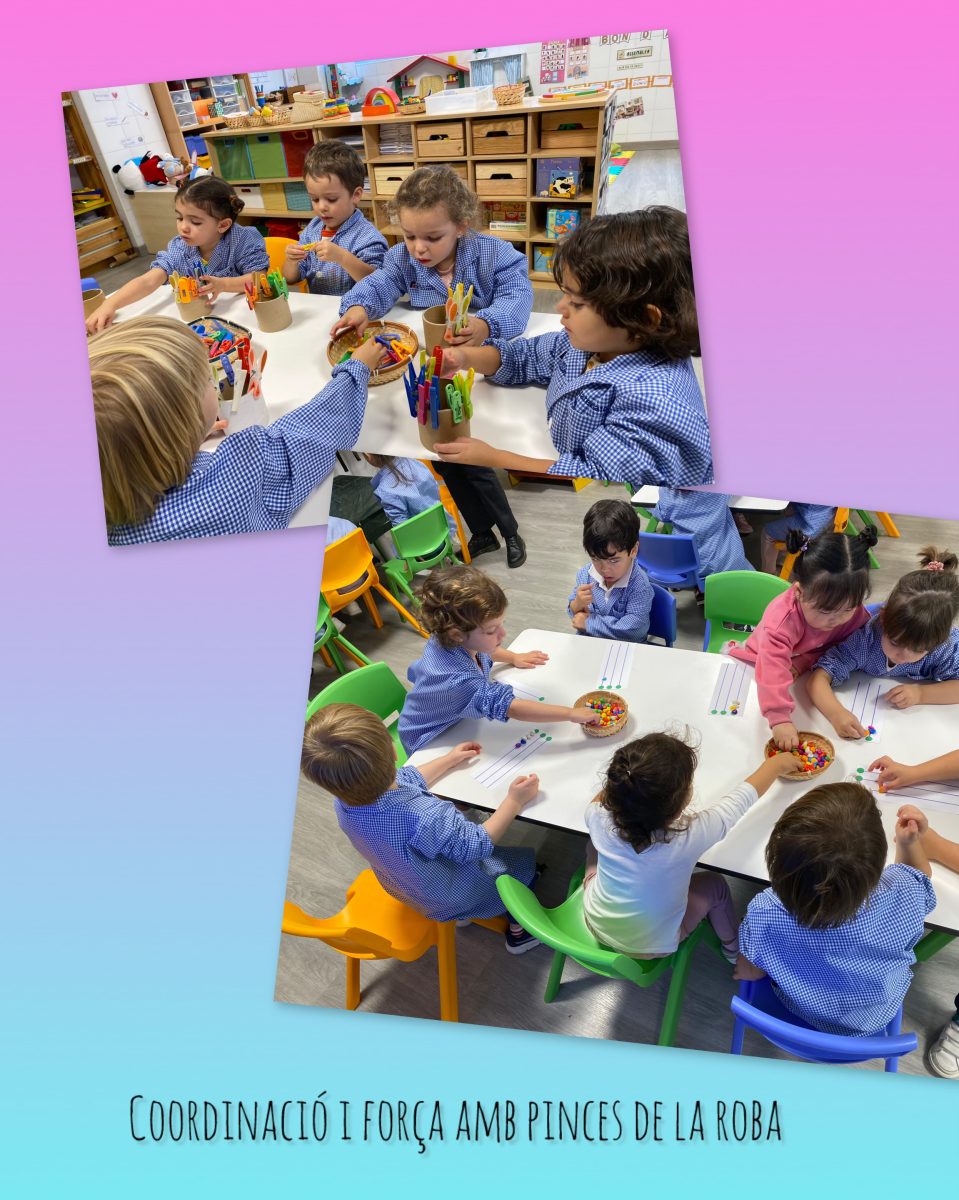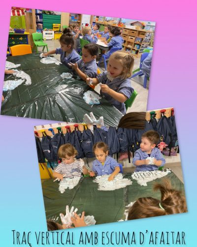 El traç el fem cada vegada millor i el reforcem utilitzant materials diversos: guixos, retoladors, ceres, etc. Alhora, aprenem a fer bé la pinça i molts ja prenem consciència de com hem de posar els dits per ser més precisos en els nostres traços.