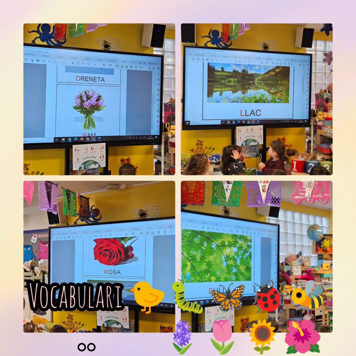 Aquesta setmana hem començat a donar-li la benvinguda a la primavera, s’allarguen els dies i arriba el bon temps! Hem après vocabulari relacionat amb aquesta estació i al pati ens hem fixat en les flors que floreixen i els insectes que hi surten pel voltant: papallones, marietes…