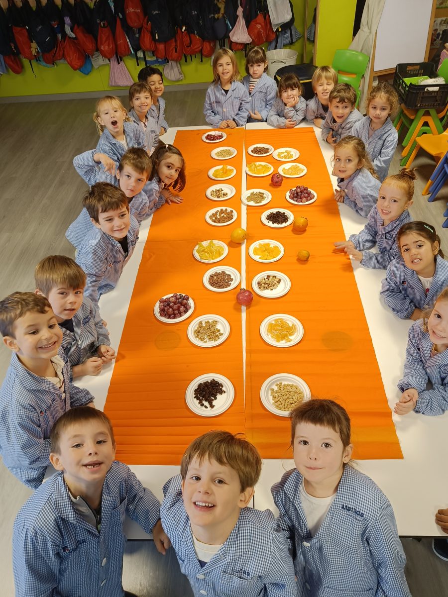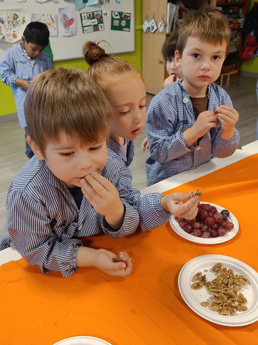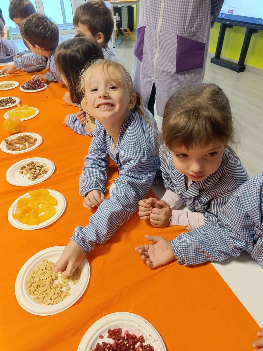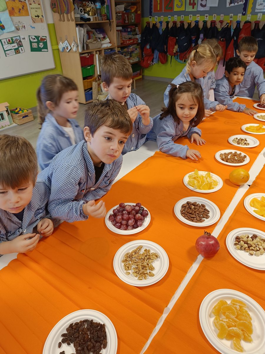 Hem pogut veure, tocar i tastar diferents fruits com la magrana, la mandarina, la taronja, el caqui, el raïm i fruits secs com avellanes, ametlles, nous, cacauets, figues i també hem tastat codony!