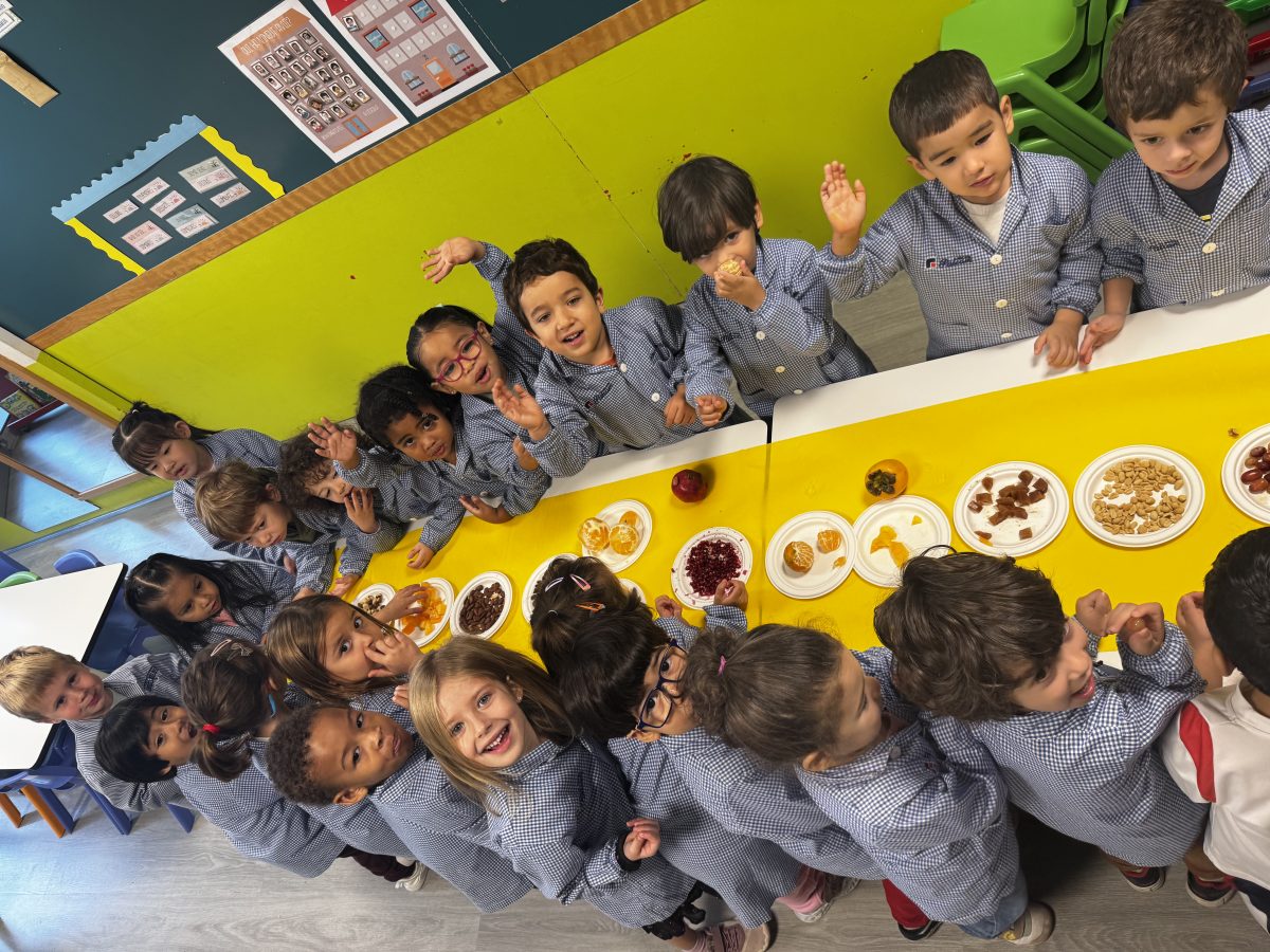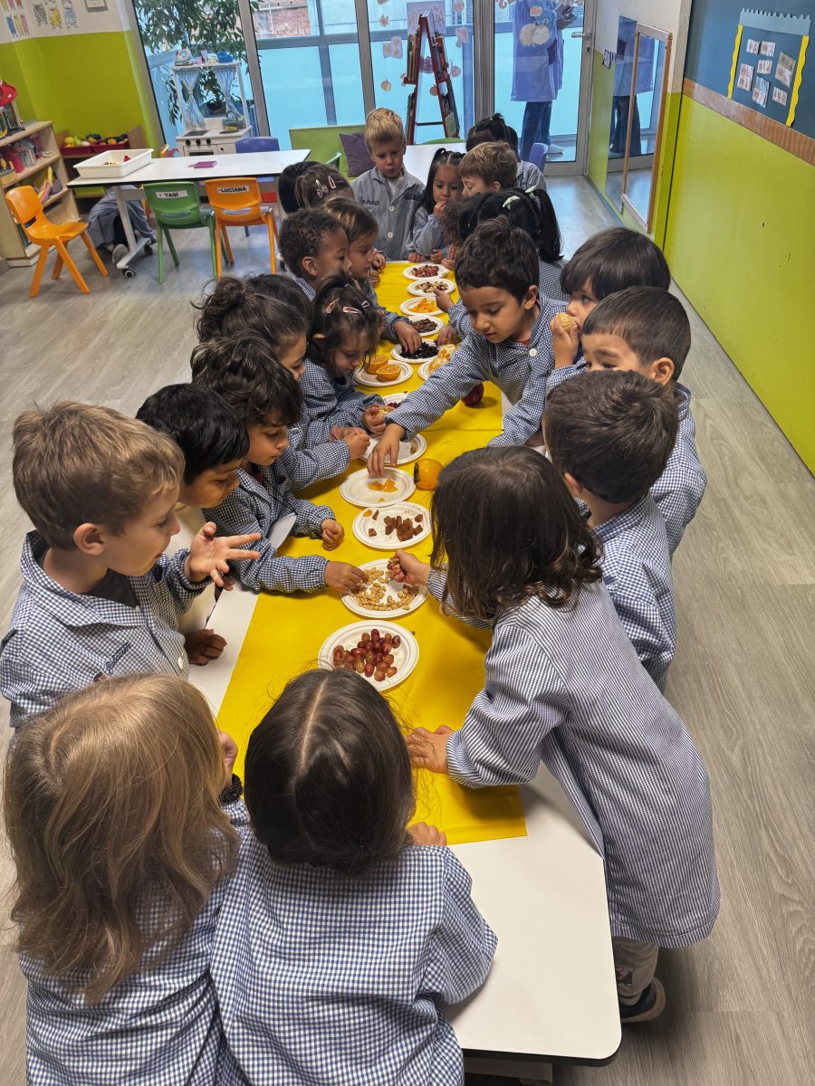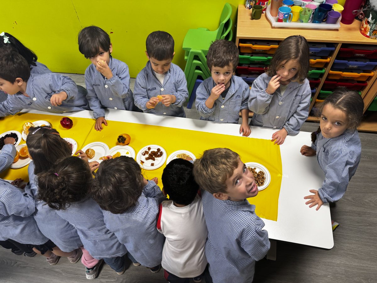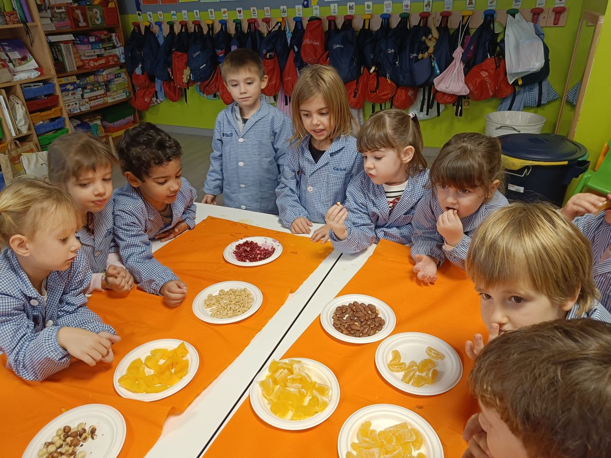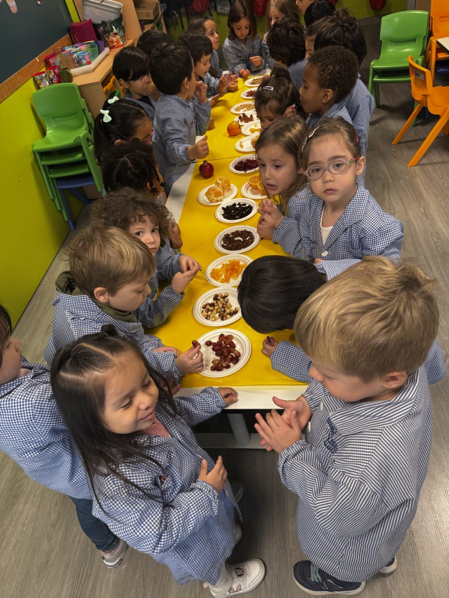 Hem pogut veure, tocar i tastar diferents fruits com la magrana, la mandarina, la taronja, el caqui, el raïm i fruits secs com avellanes, ametlles, nous, cacauets, figues i també hem tastat codony!